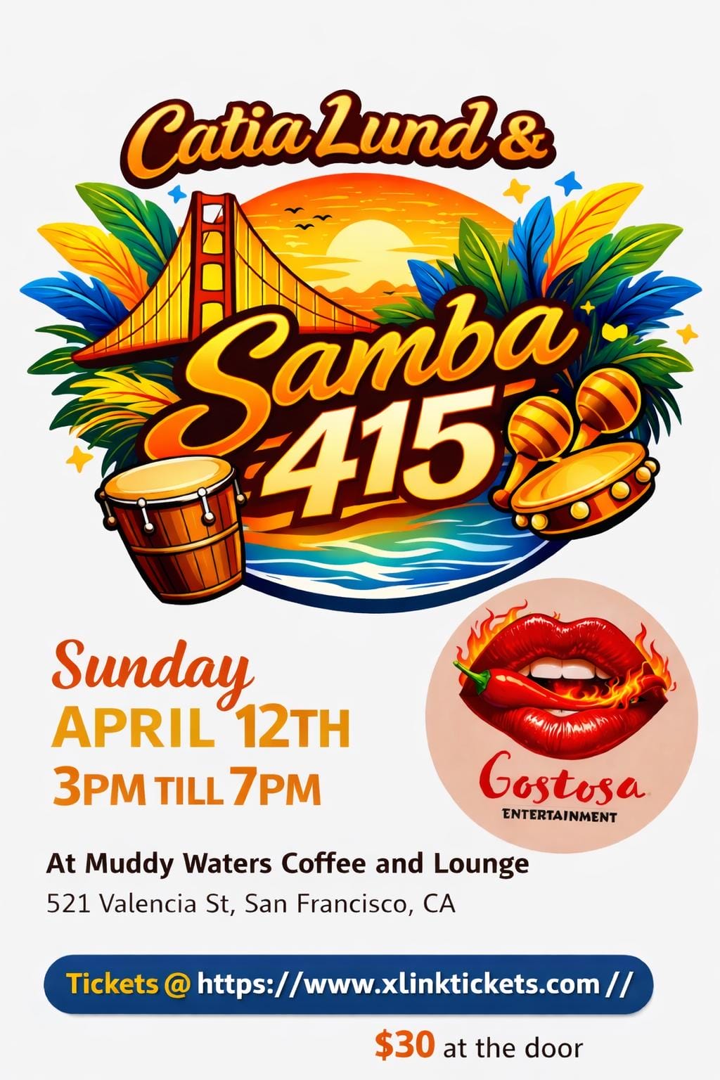 Catia Lund & Samba 415 Catia Lund & Samba 415 by 51 51 people viewed this event. Date And Time 2026-04-12 @ 03:00 PM to 2026-04-12 @ 06:00 PM Registration End Date 2026-04-12 Location MUDDY WATERS COFFEE AND LOUNGE Event Types Concert or Performance Event Category Community & Culture Share With Friends Facebook Twitter Linkedin Xing Pinterest